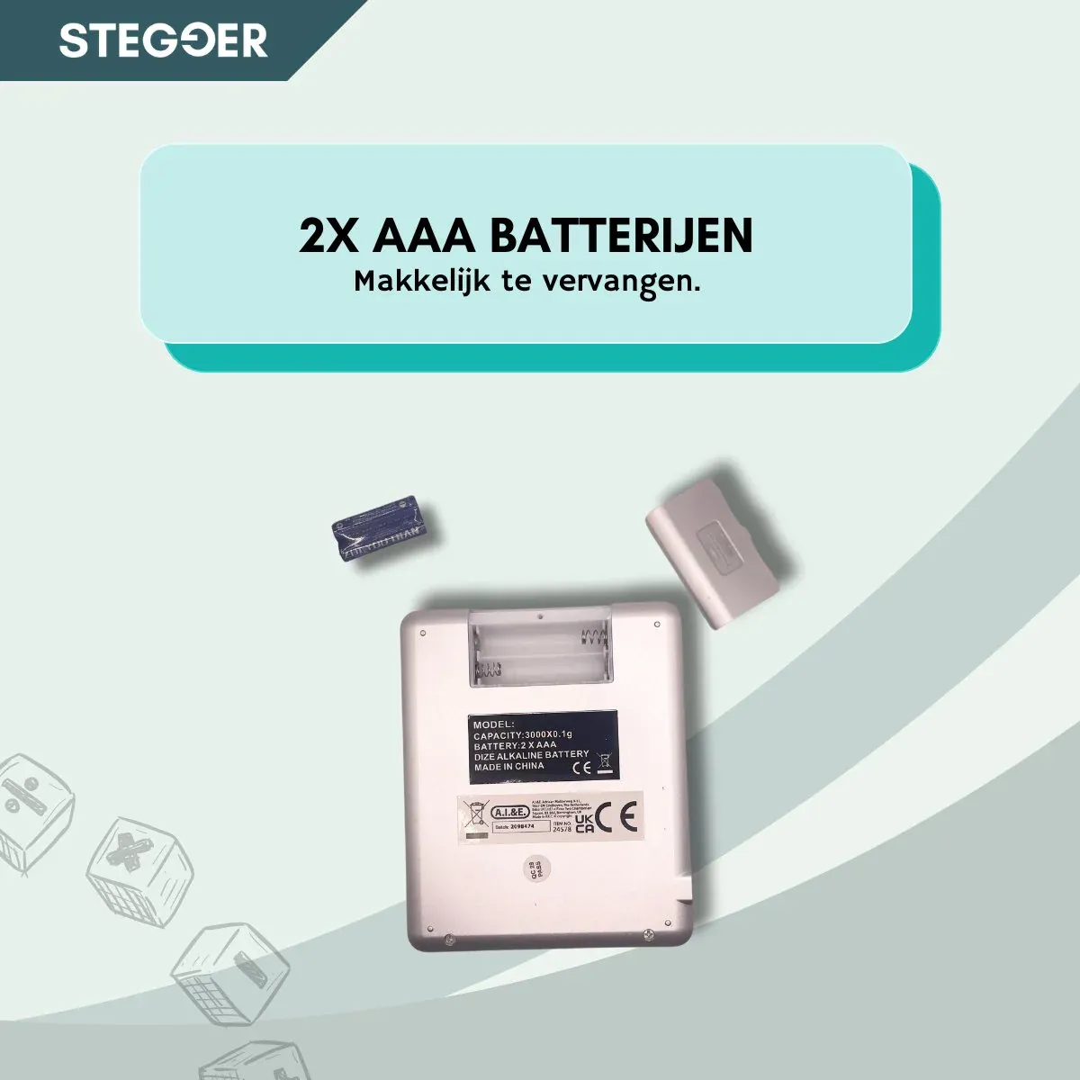 De weegschaal wordt aangedreven door twee AAA-batterijen, die eenvoudig te vervangen zijn wanneer nodig. Dit maakt de Stegger Digitale Weegschaal niet alleen efficiënt in gebruik, maar ook betrouwbaar voor dagelijks gebruik. Met een compact en stijlvol ontwerp past deze weegschaal naadloos in je keuken, zonder veel ruimte in beslag te nemen.